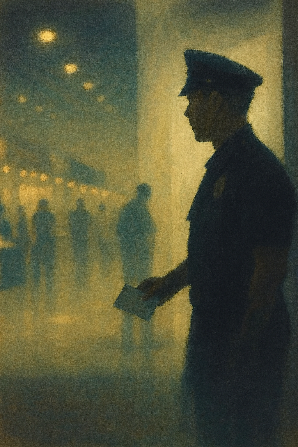 As I scanned the crowd, I noticed a police officer entering through a side door, clutching a small piece of paper in his hand. Methodically, he moved from booth to booth, speaking briefly to the staff at each one — his approach slow and deliberate. With each step closer, a ripple of unease moved through me.